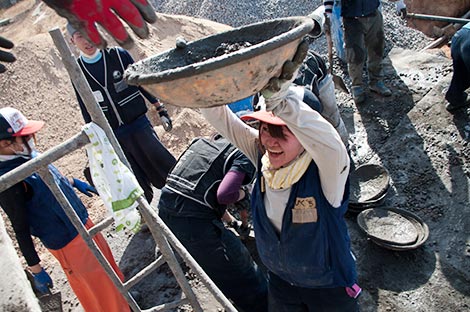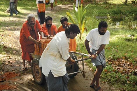 Vi bruger ikke entreprenører. Alle materialerne - mursten, vinduer, døre, borde, stole, senge - er produceret internt. Elektriske installationer, vvs og struktur er alt sammen udført af frivillige. Men Amma placerer æren for hendes succes helt og holdent på skuldrene af hendes tilhængere i hele verden.